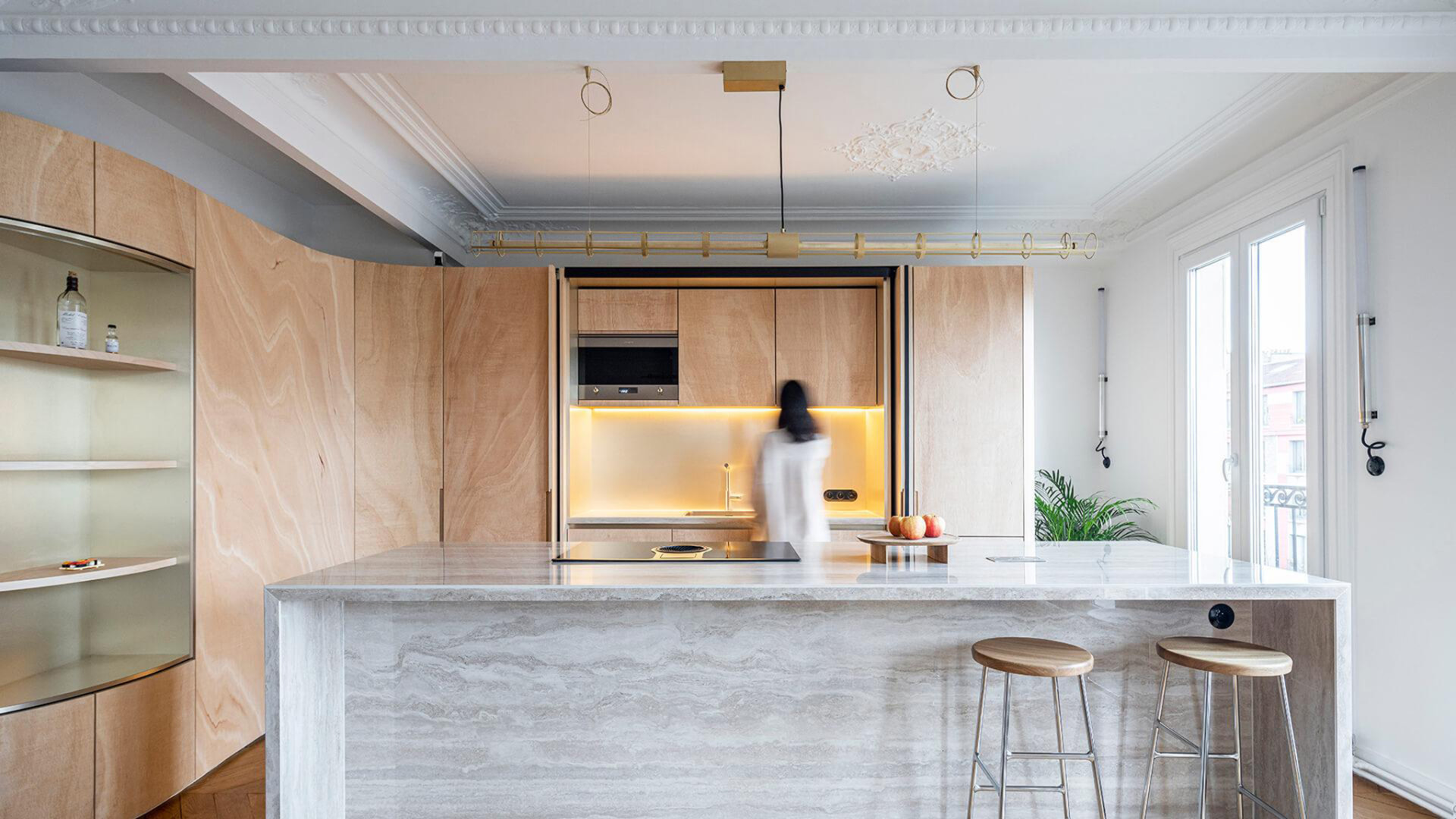 這間伍德絲帶(Wood Ribbon)是典型的奧斯曼式公寓,房間通風,陽光充足,地板襯有魚骨鑲木地板。然而,公寓最引人注目的彎曲木質隔牆,是Toledano + Architect將傳統的巴黎式公寓改建成更為適合21世紀居住的居所所呈現的獨到設計。