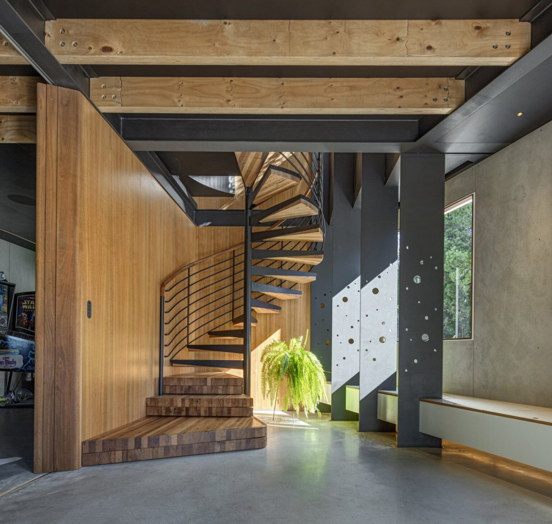 通過一個彷彿巨大的鋼罩即可入室。一樓設有家庭辦公室,遊戲室和會客室。中央的螺旋梯同時為一口井,利用煙囪效應將冷空氣從混凝土板和砌體牆吸至高樓層。