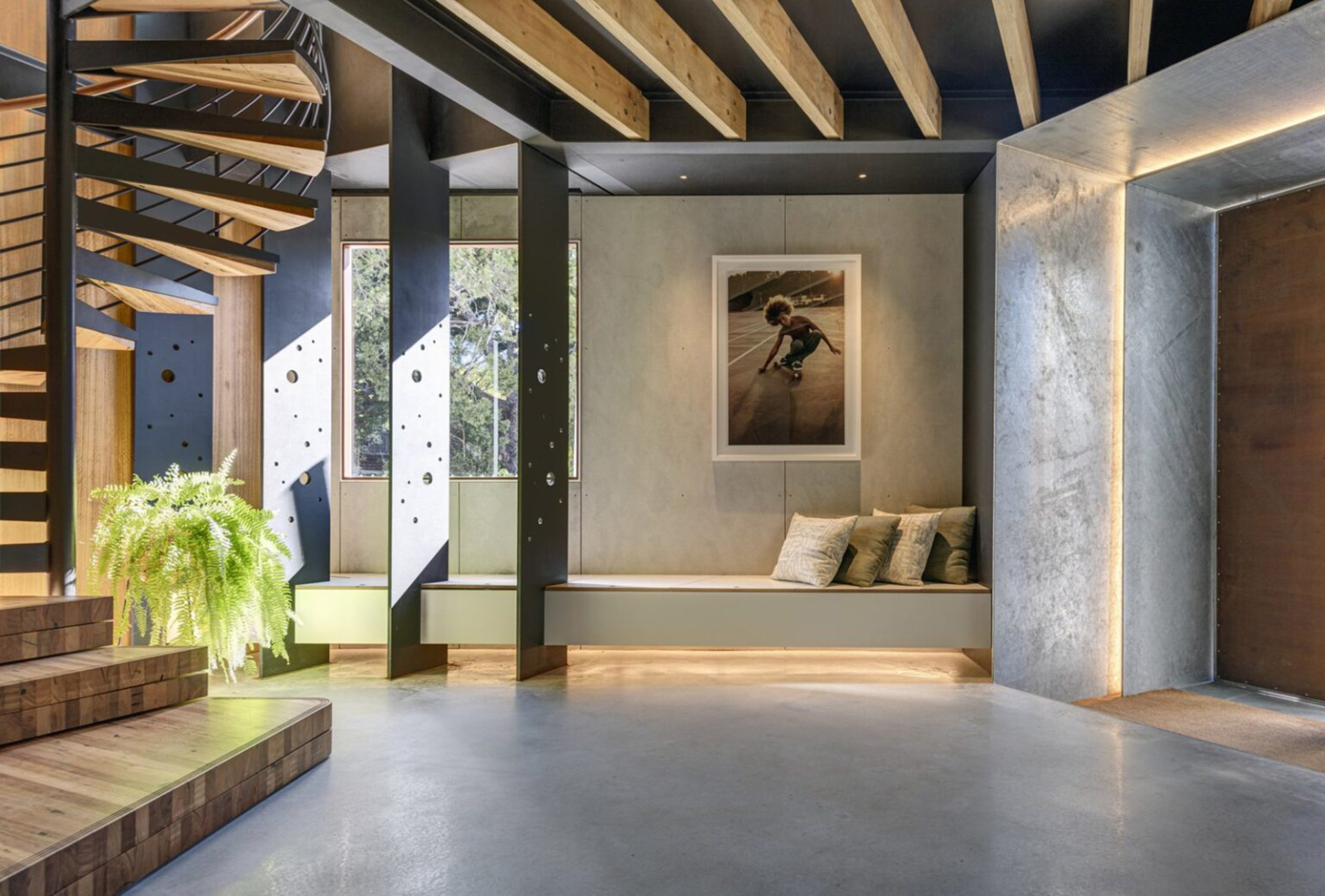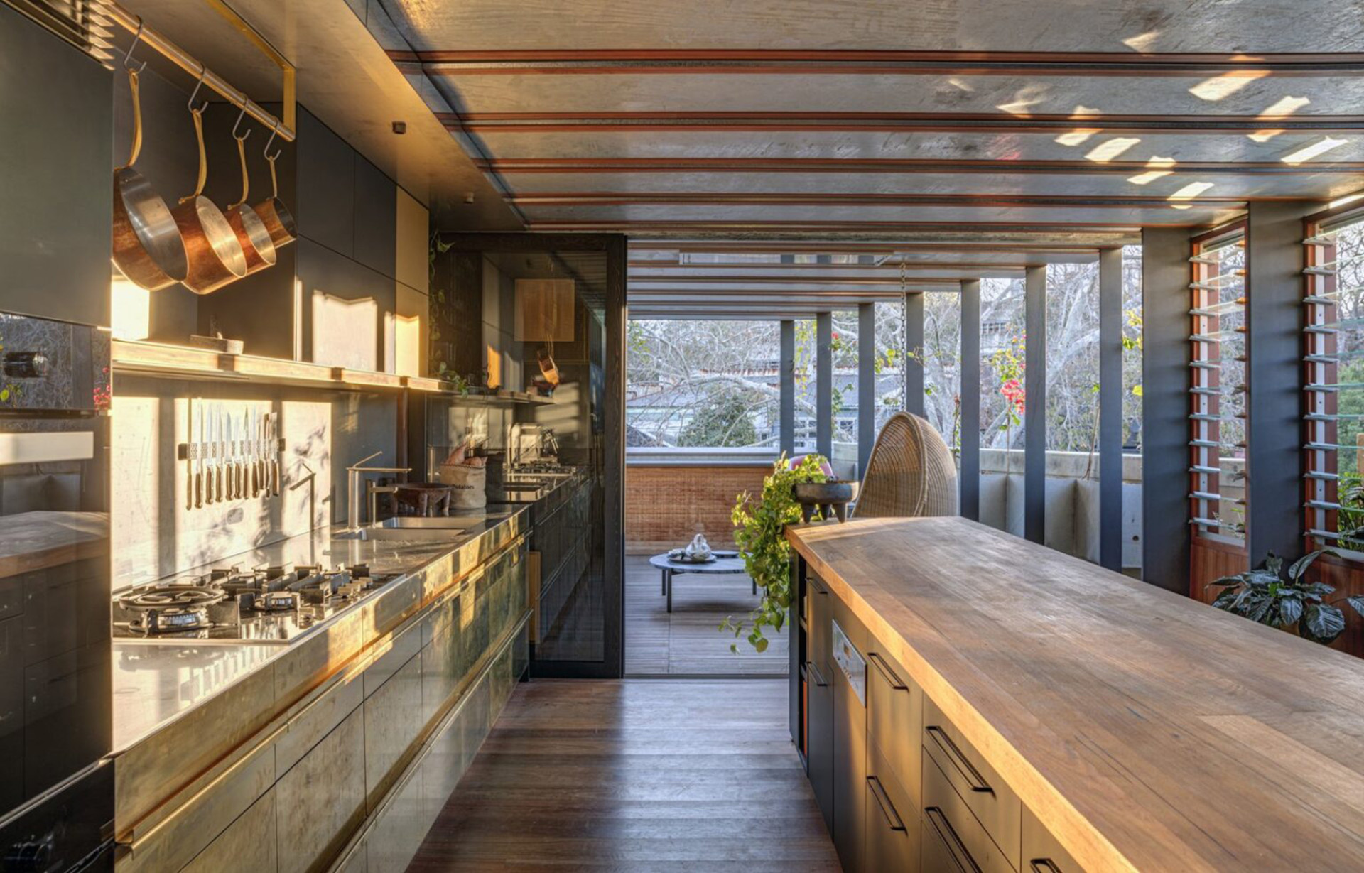 在溫暖的夏季月份,熱空氣可由房屋四周的玻璃窗面排出。車庫則連接到由太陽能電池板供電的電池存儲系統。對於Clinton Cole來說,永續環保是要親身實踐。