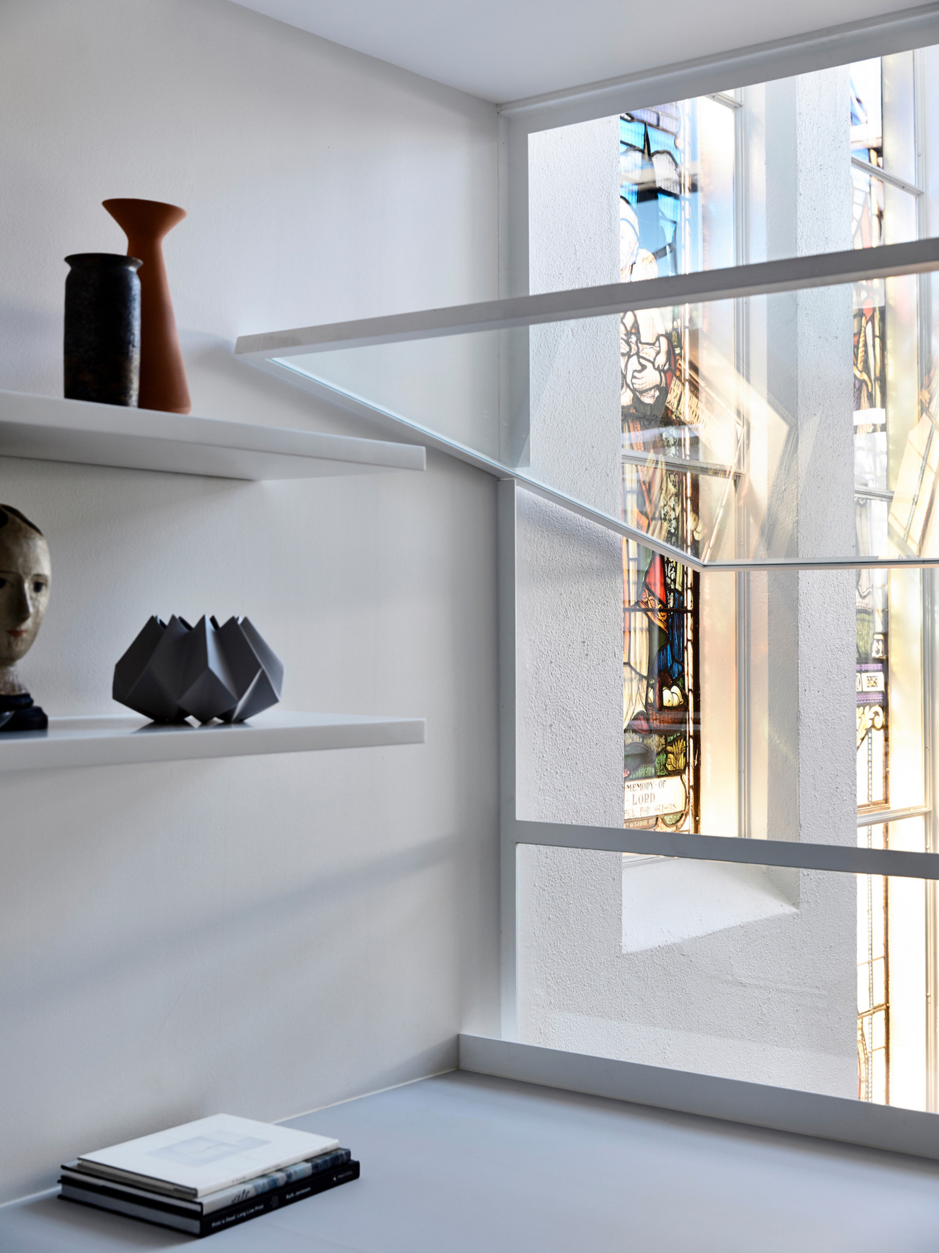 白色和灰色的調色板構成了房屋的基礎,再加上傳統的青銅和大理石飾面,向原本肅穆莊嚴的教堂致敬。面對教堂歷史的洪流,最為相關的一點也許是原始鑲木地板的修復、保留和重新拋光。