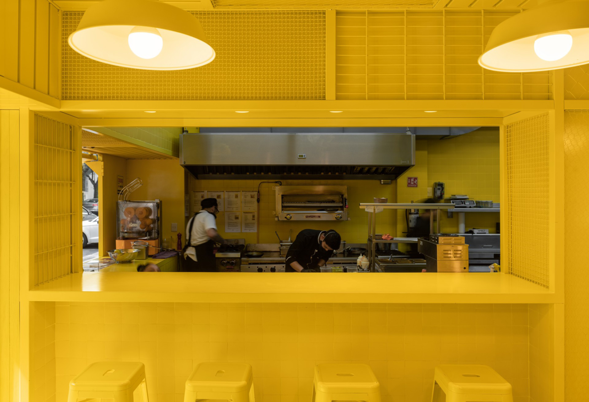 除了鮮豔活潑的蛋黃色,店內的陳設使用了不同樣式的鐵網,既將空間區隔開來,也能作為裝飾,在將空間最大化的同時也讓人聯想到了墨西哥普通農家中的雞舍,在創新的同時也向傳統致敬。
