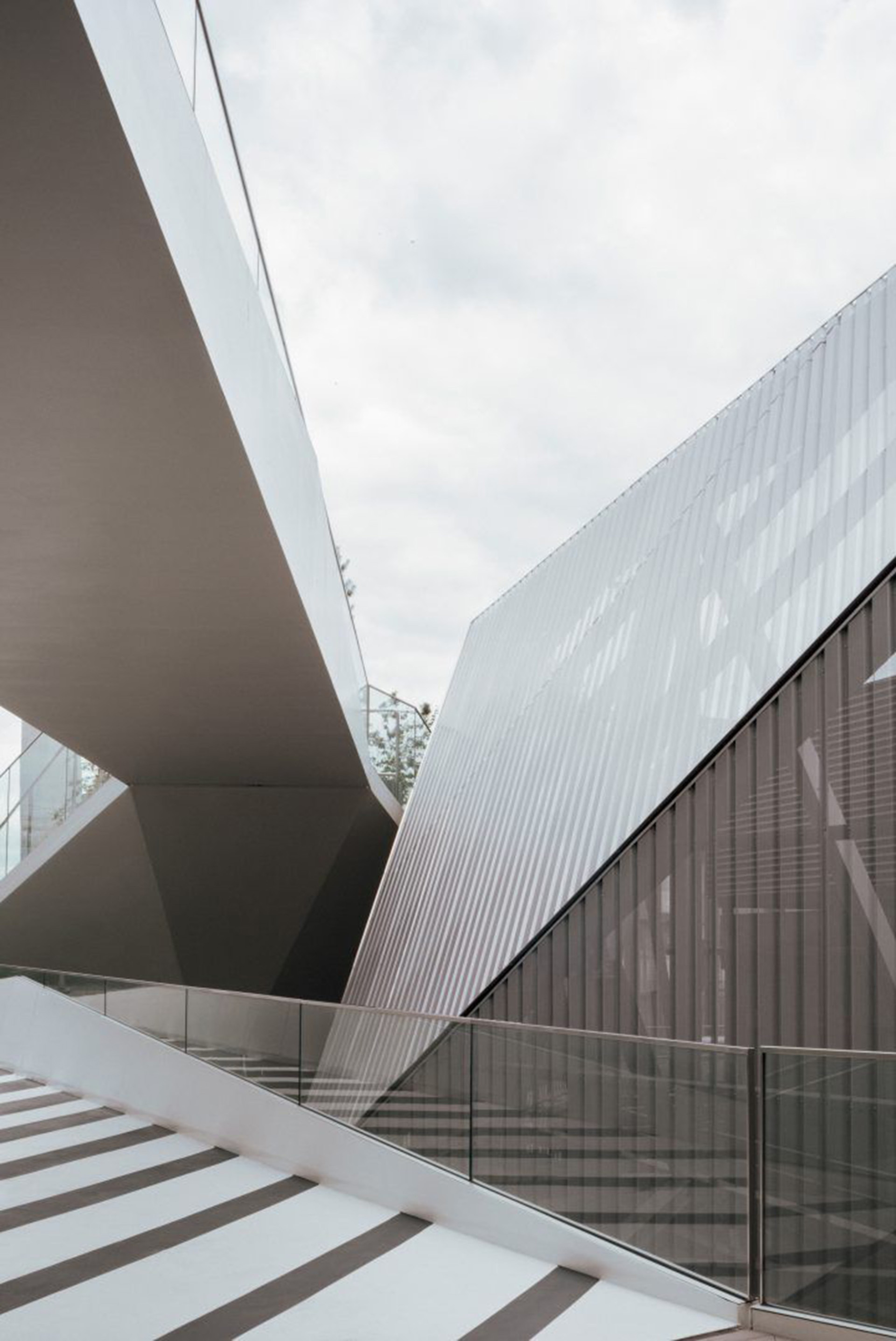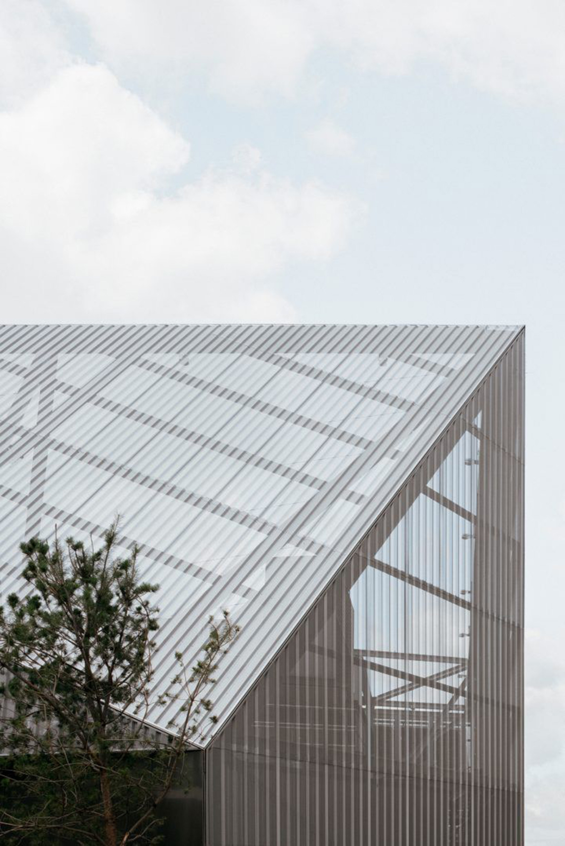 Named ‘North Greenwich Sculptural Screen’, the monumental object is characterized by its angular form. Wrapped in corrugated aluminum, the structure’s facade is perforated, granting it an almost translucent quality and generating playful patterns of light. “The corrugated metal skin both obscures and reveals the infrastructure contained within, creating a subtly dynamic veil that changes expression throughout the day,” explains the firm. Lightweight yet strong, the shell-like enclosure acts as a camouflage while incorporating a large digital media screen, public restrooms, and a small cafe concealed by a full-height bi-fold door.