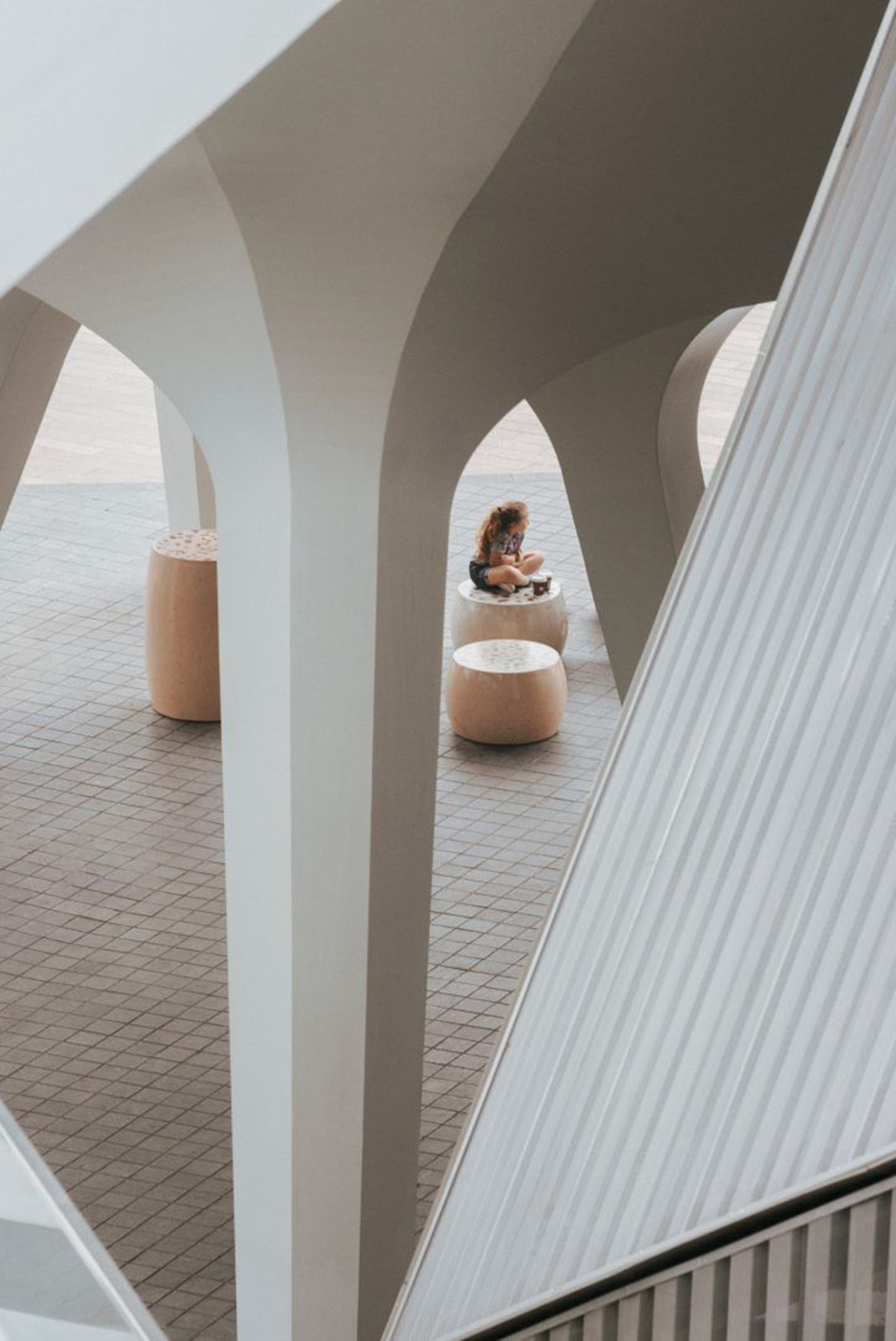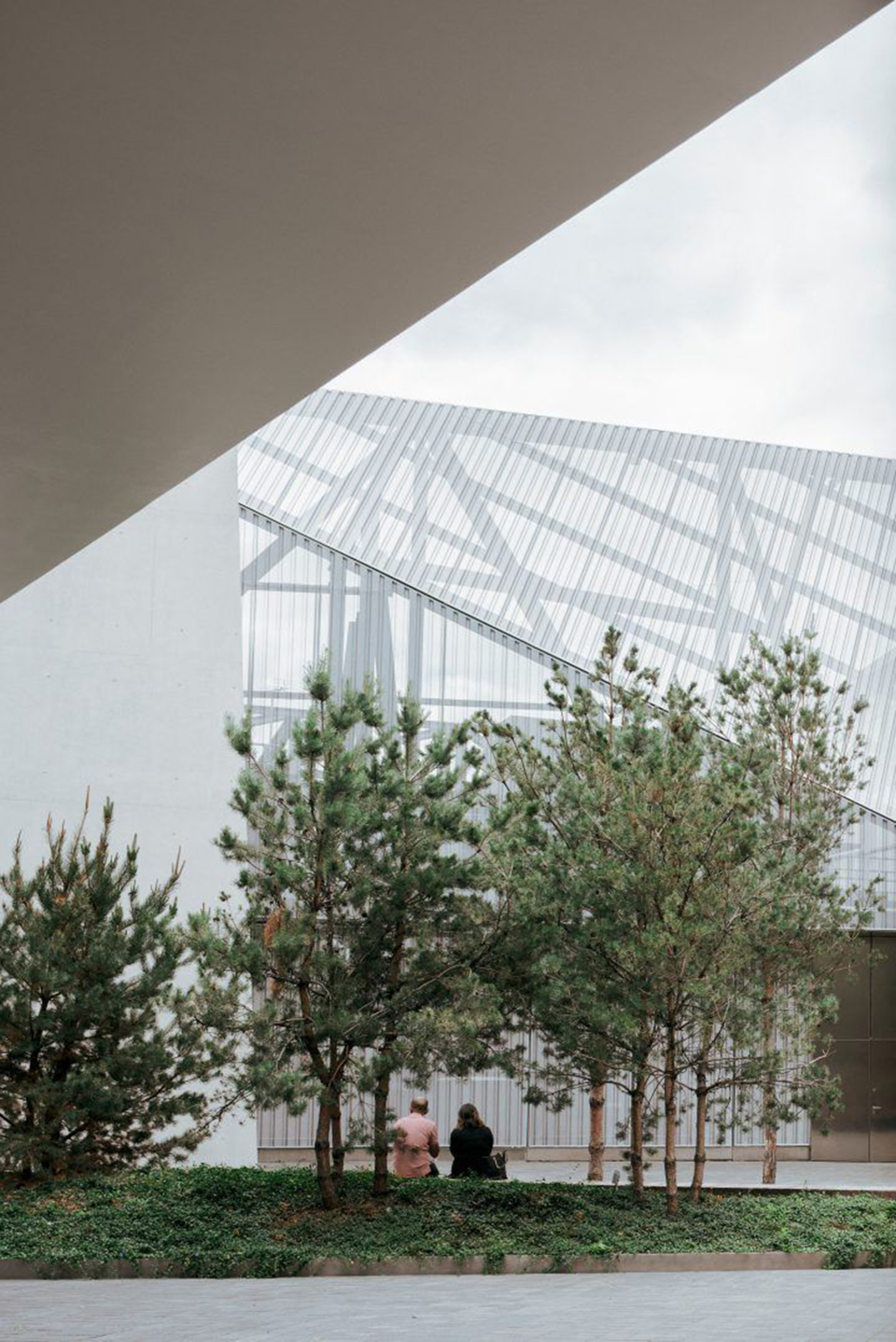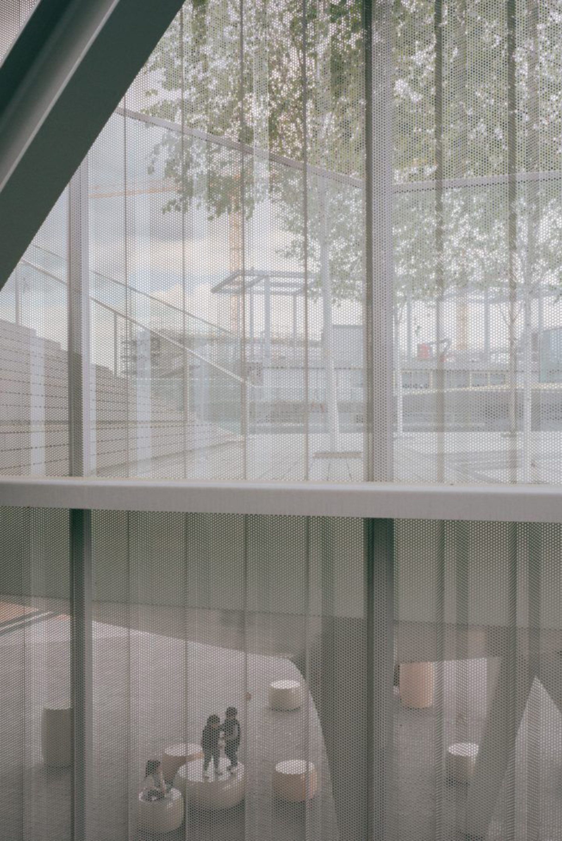 Fading into the background and distorting the light that passes through, the structure is unobtrusive compared to the eclectic geometries that surround it. However, as its perforated metal catches the light throughout the day, the architecture snaps suddenly into crisp view. The project was meticulously designed to be in a dialog with the adjacent Tide elevated linear park, conceived by the same firm, together with Diller Scofidio + Renfro. “The two works of architecture are geometrically twisting past one another—almost dancing—though they never touch and are expressed with intentionally contrasting visual languages. While the Tide is curved and solid, the screen enclosure is angular and translucent,” concludes the firm.